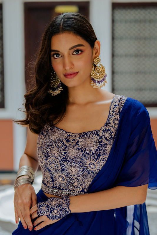 Ink Blue Embroidered Organza Pre-Draped Ruffle Saree Set