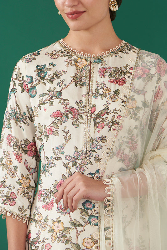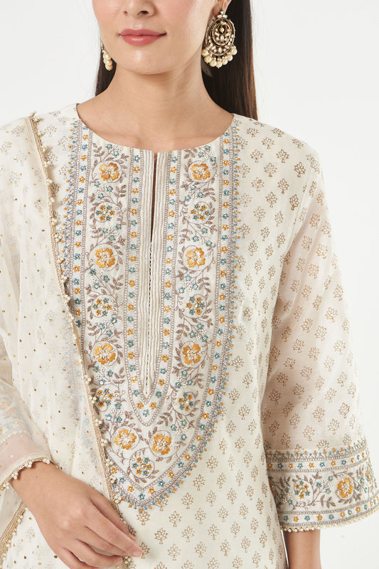 Ivory Chiffon Printed & Embroidered Straight Kurta Set