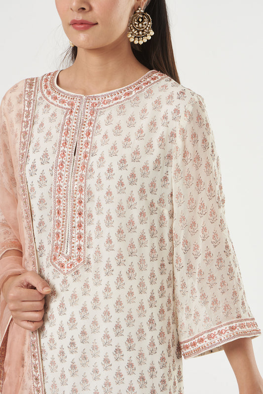 Ivory Georgette Floral Embroidered Straight Kurta Set