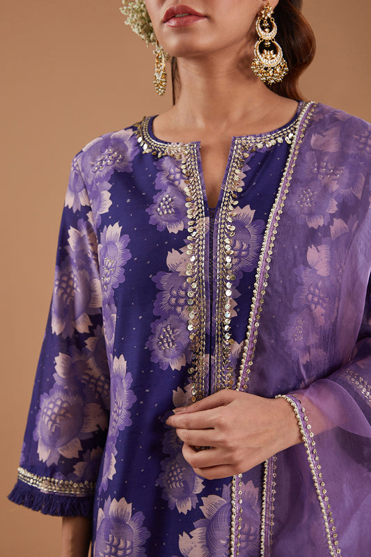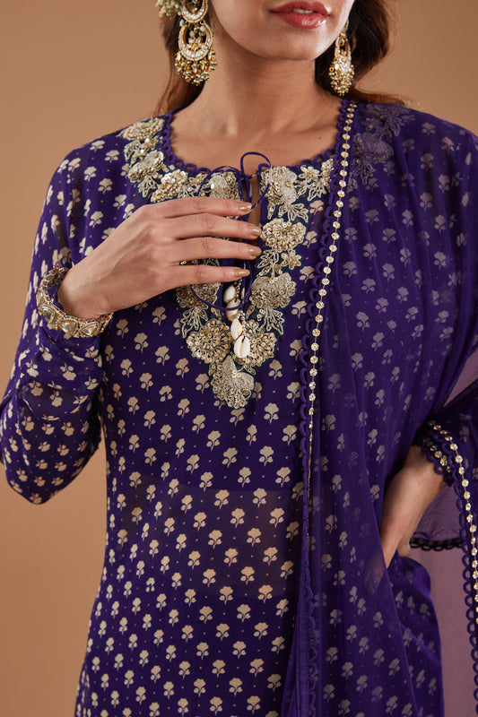 Ink Blue Printed & Embroidered Georgette Kurta Set