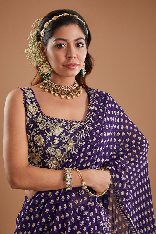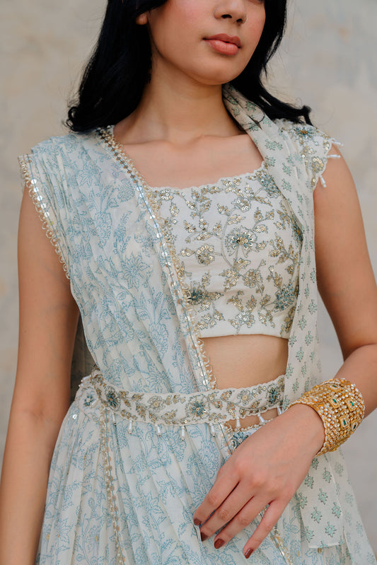 Indigo Silk Printed & Embroidered Concept Lehenga Set