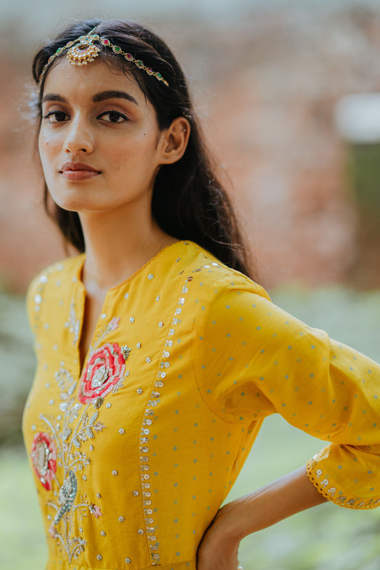 Mustard Chanderi Silk Flared Kurta Set