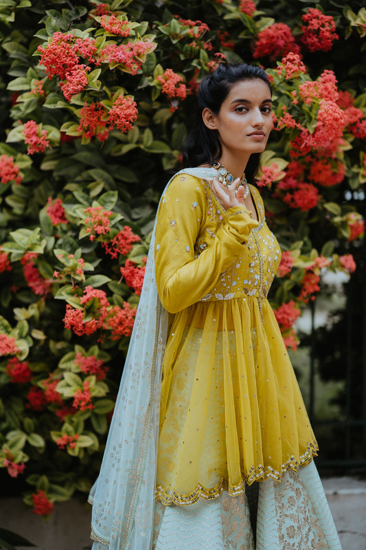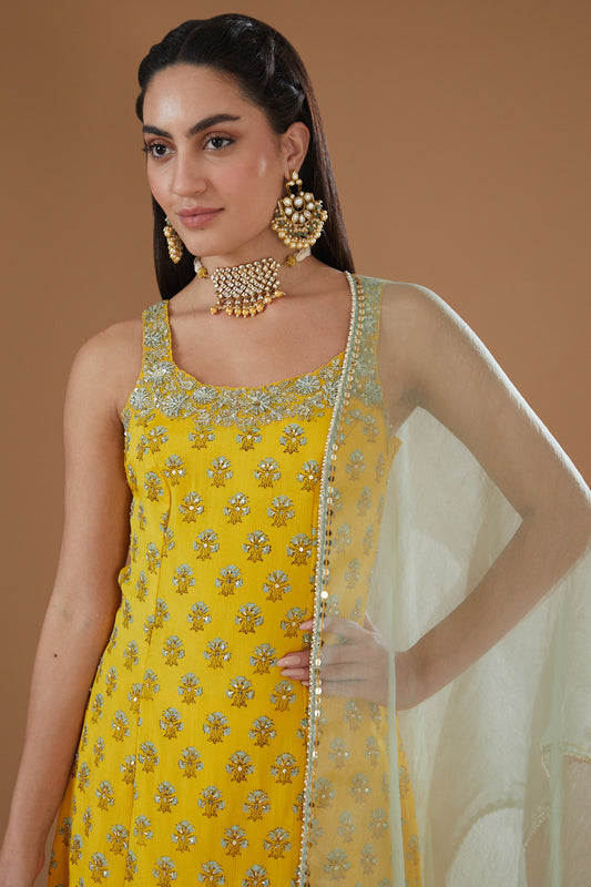 Mustard Chiffon Embroidered Flared Anarkali Set