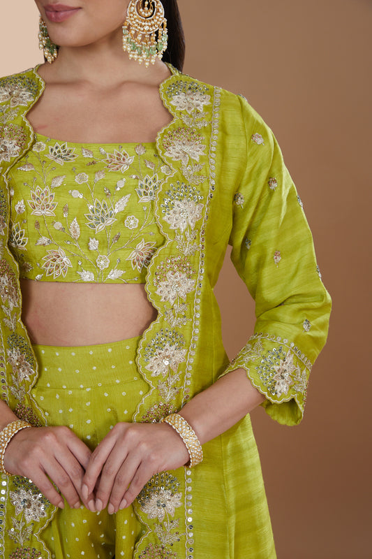 Moss Green Silk Embroidered Long Jacket Sharara Set