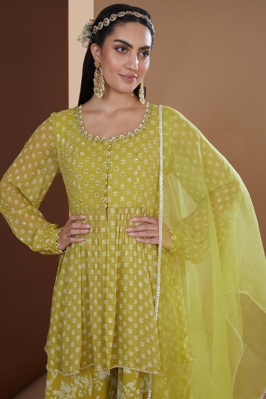 Mustard Chiffon Short Kurta Sharara Set