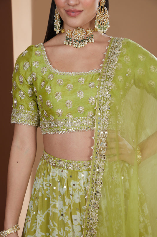 Moss Green Printed And Embroidered Silk Lehenga Set