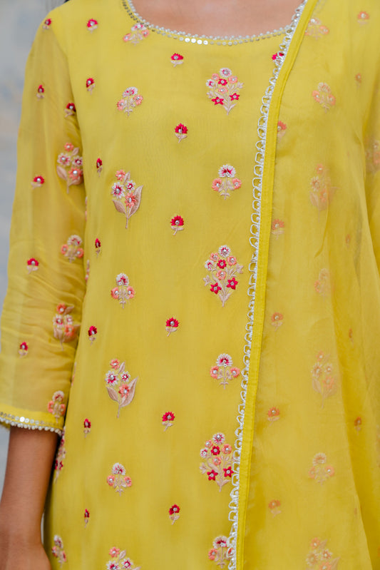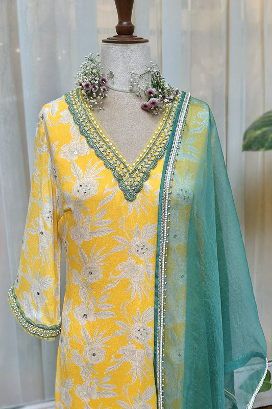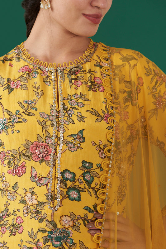 Mustard Chiffon Printed & Embroidered Jacket Set