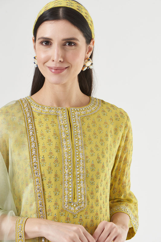 Mustard Chiffon Printed & Embroidered Straight Kurta Set