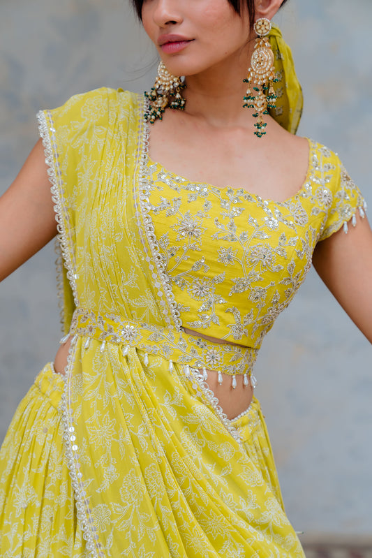 Moss Green Printed And Embroidered Lehenga Set