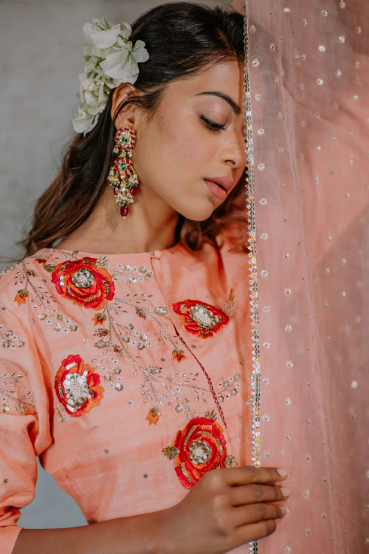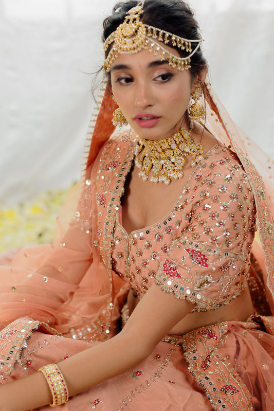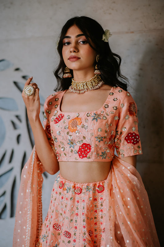 Peach Silk Floral Embroidered Lehenga Set