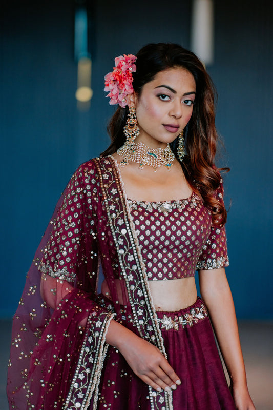 Plum Silk Banarasi Embroidered Lehenga Set