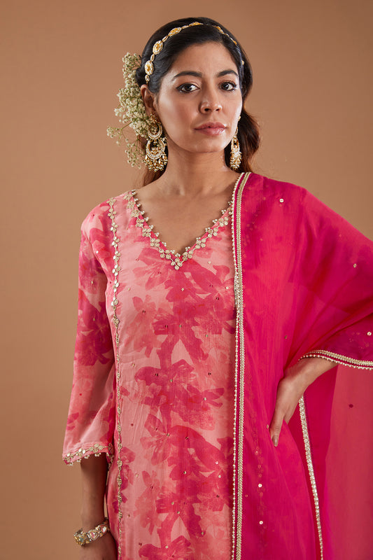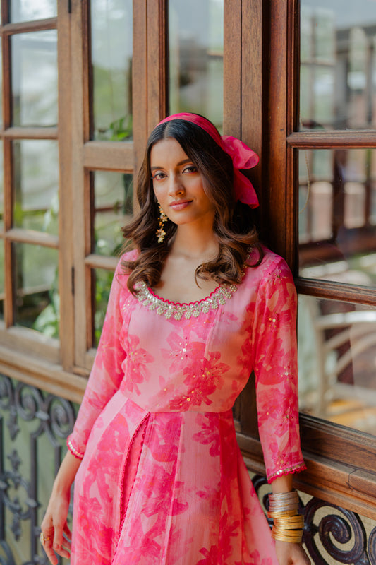 Pink Printed & Embroidered Chiffon Kurta Set
