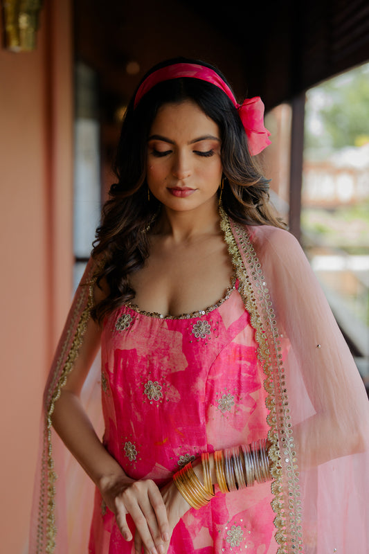 Pink Printed & Embroidered Silk Sharara Set