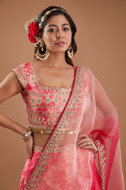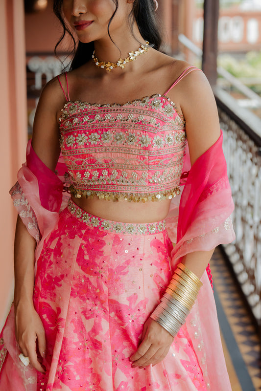 Pink Floral Printed & Embroidered Silk Lehenga Set