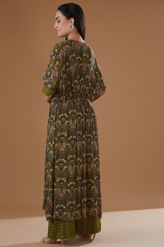 Olive Green Chiffon Floral Printed Kaftan Set