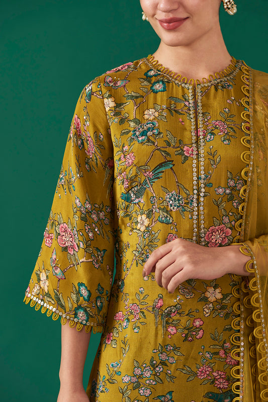 Olive Chiffon Printed & Embroidered Straight Kurta Set
