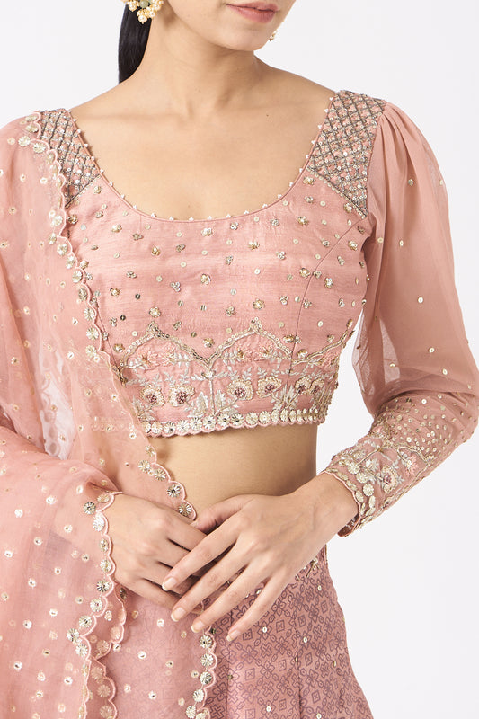 Pink Printed & Embroidered Silk Lehenga Set