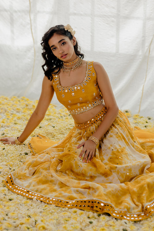 Mustard Tie-Dye Mirror-Work Lehenga Set