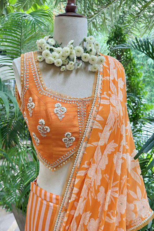 Orange Silk Printed & Embroidered Lehenga Set