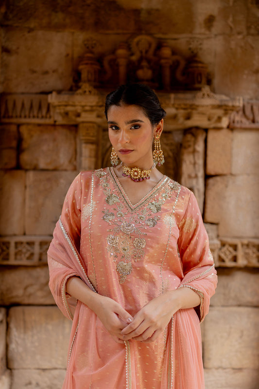 Rose Pink Embroidered Tissue Kurta Set