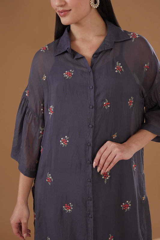 Powder Grey Organza Floral Embroidered Tunic Shirt Set