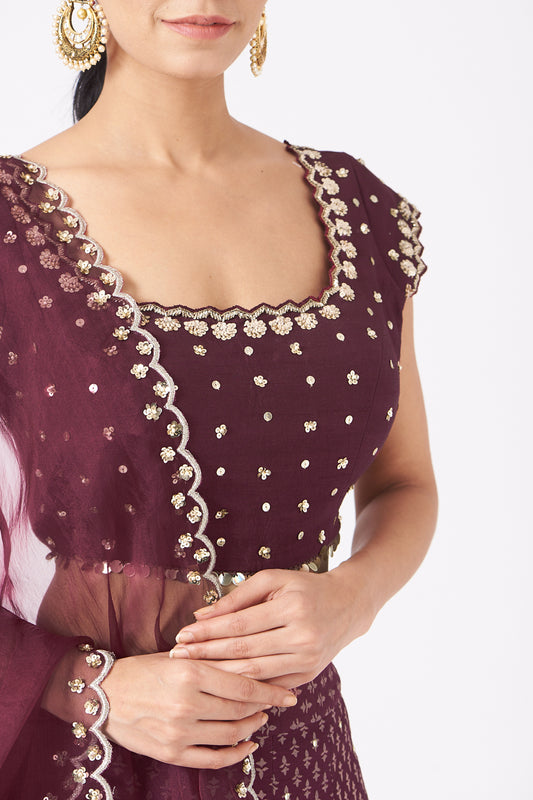 Plum Silk Printed & Embroidered Lehenga Set