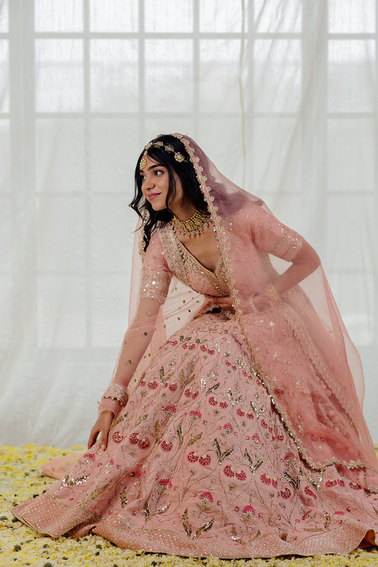 Powder Pink Silk Embroidered Bridal Lehenga Set