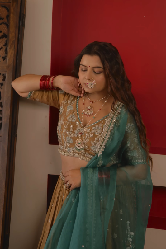 Radhika In Mocha Tissue Embroidered Lehenga Set