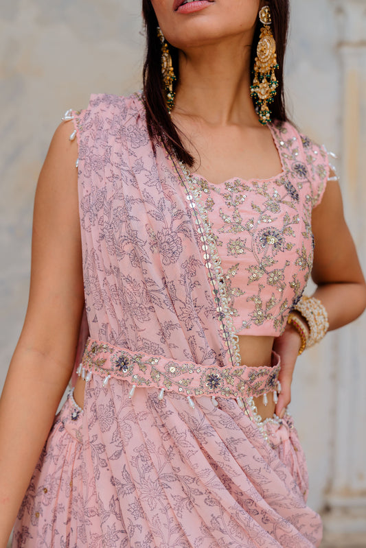 Powder Pink Organza Pre-Draped Ruffle Saree Set