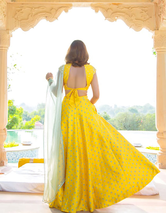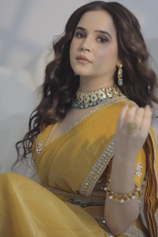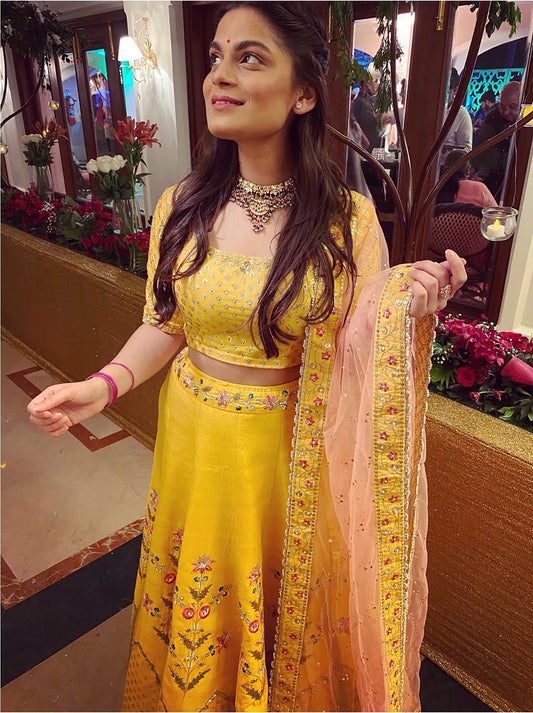 Srishti Dixit In Mustard Silk Embroidered Lehenga Set