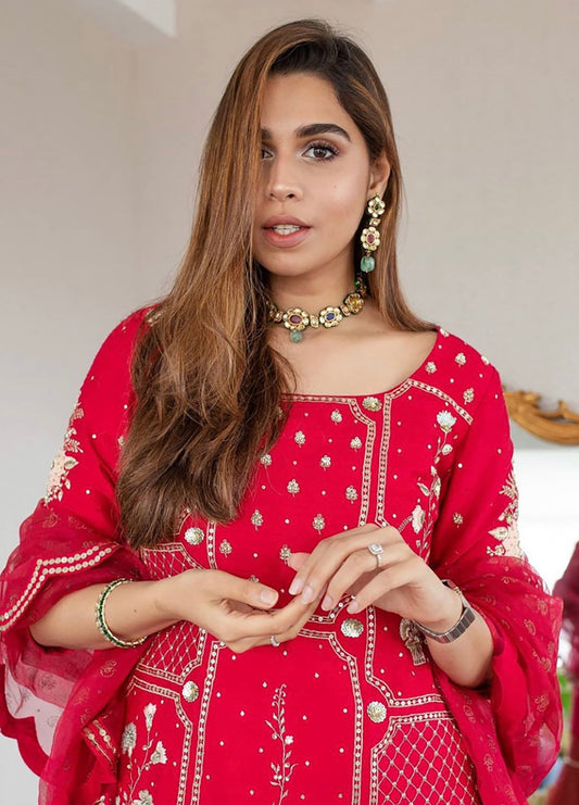 Summiyya In Cherry Red Silk Embroidered Gharara Set