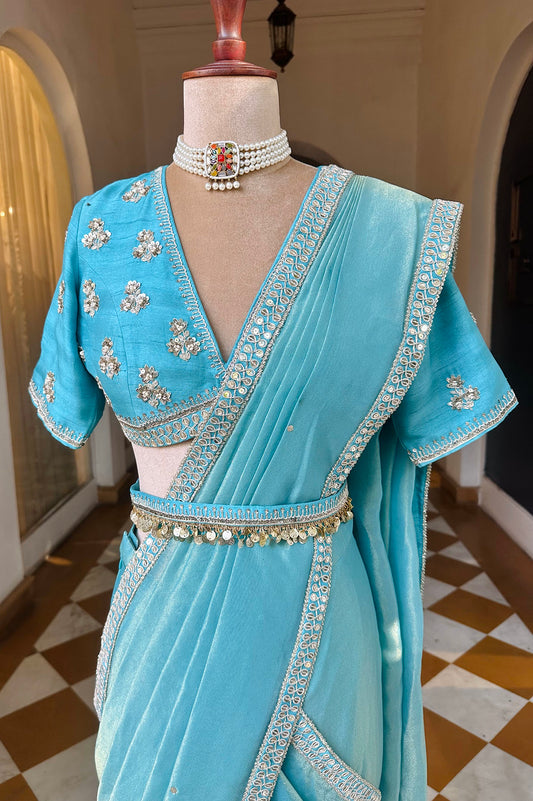 Shiv Shakti In Marigold Yellow Tissue Draped Saree Set