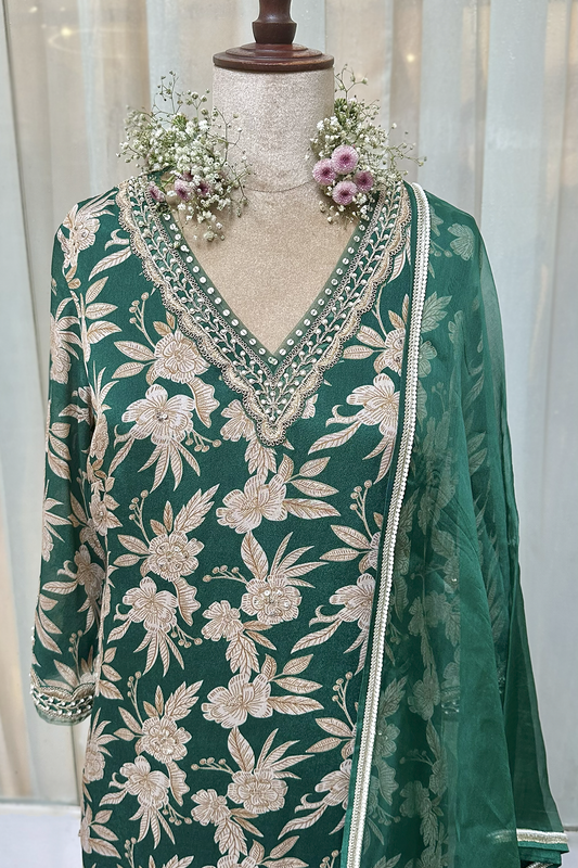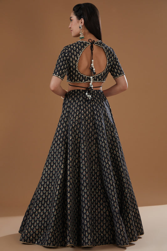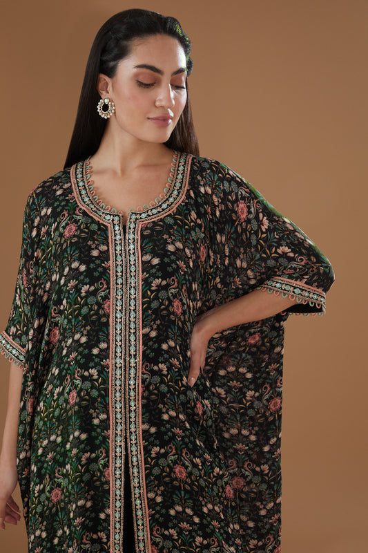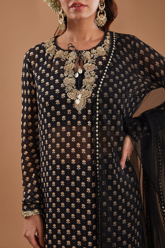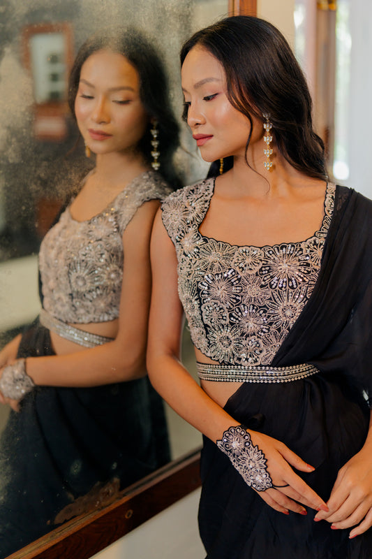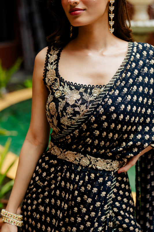 Black Printed & Embroidered Pre-Draped Georgette Saree Set