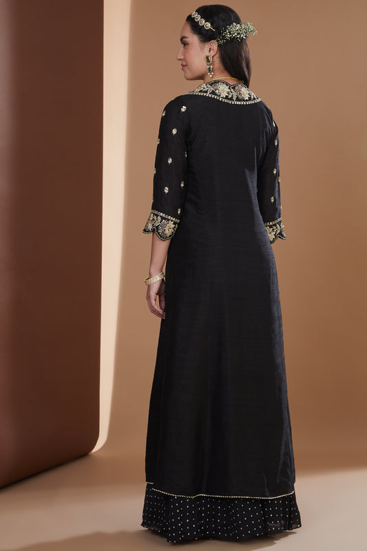 Black Embroidered Organza Pre-Draped Ruffle Saree Set