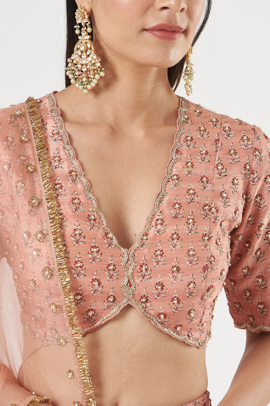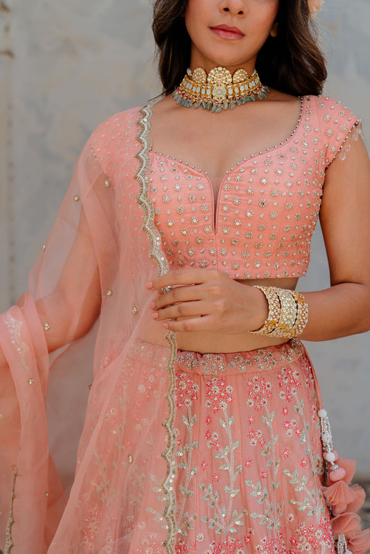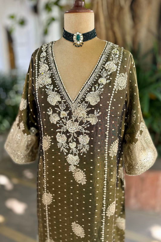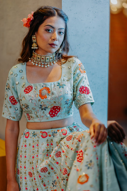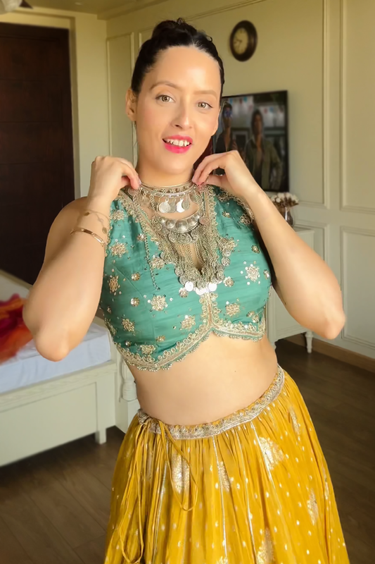 Arisha In Mustard-Jade Embroidered Tissue Lehenga Set