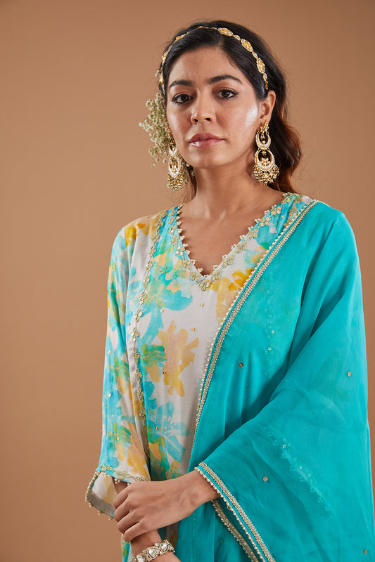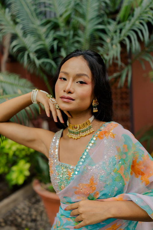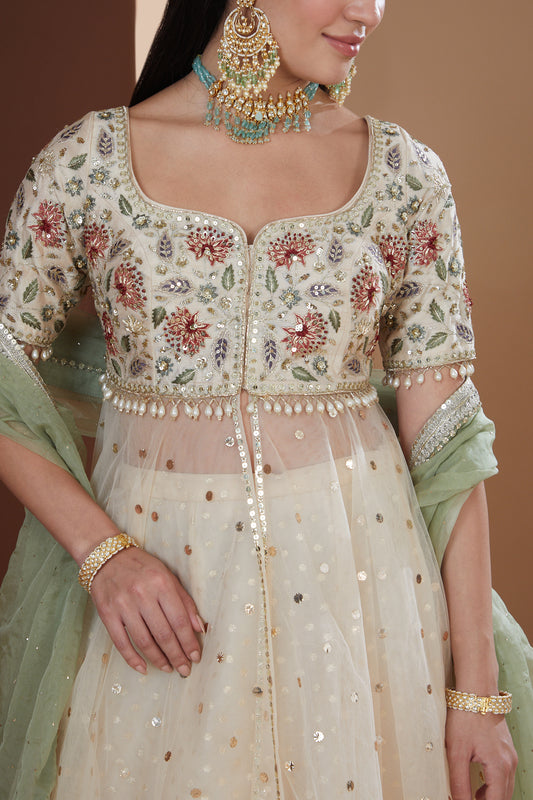 Ecru Multicolor Embroidered Flared Lehenga Set