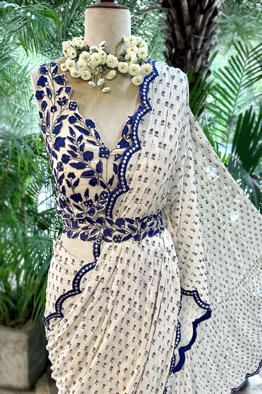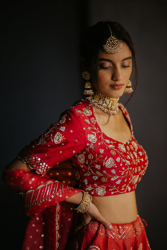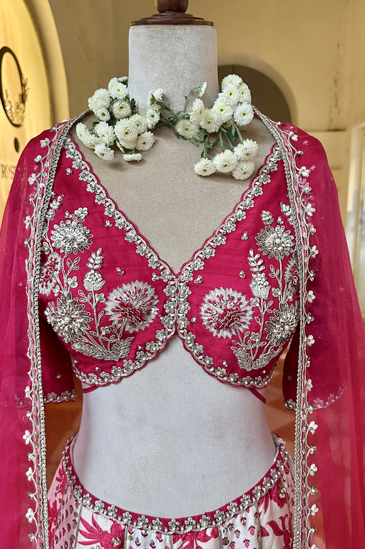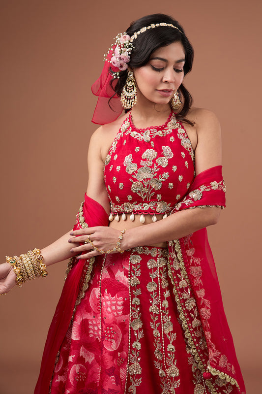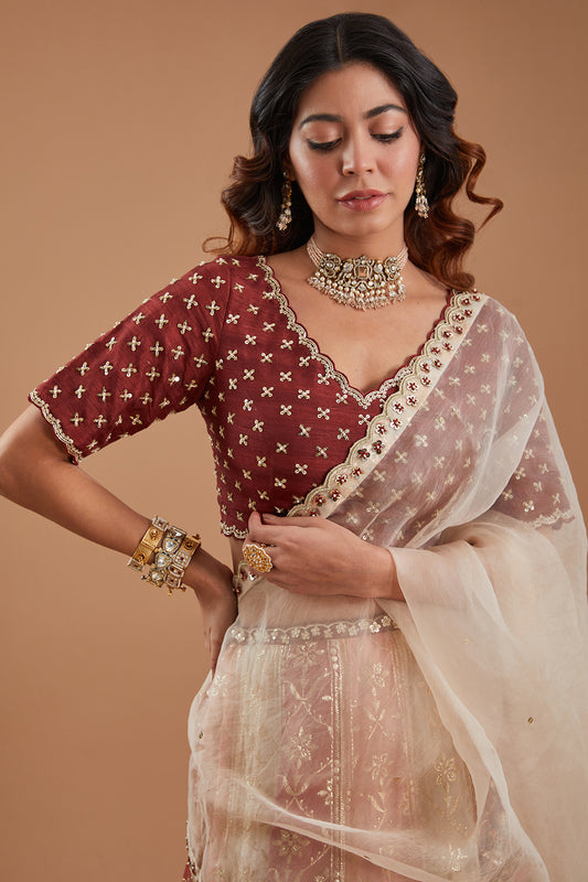 Ecru-Crimson Silk Embroidered Concept Lehenga Set