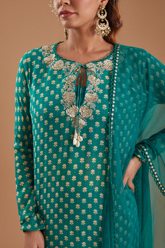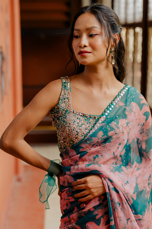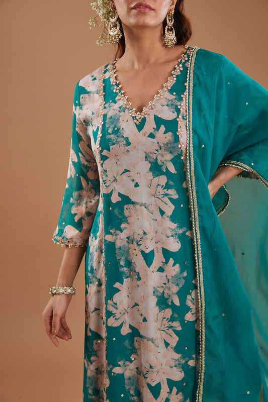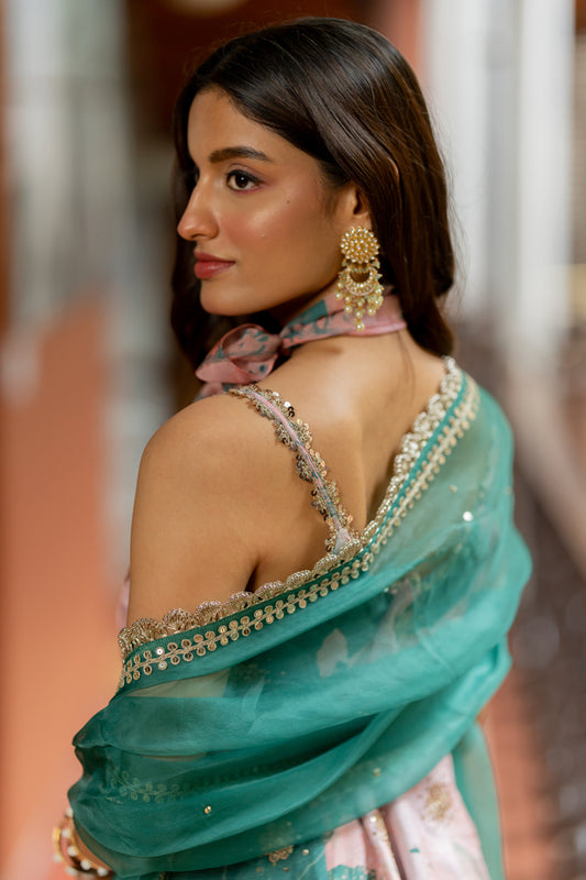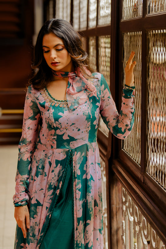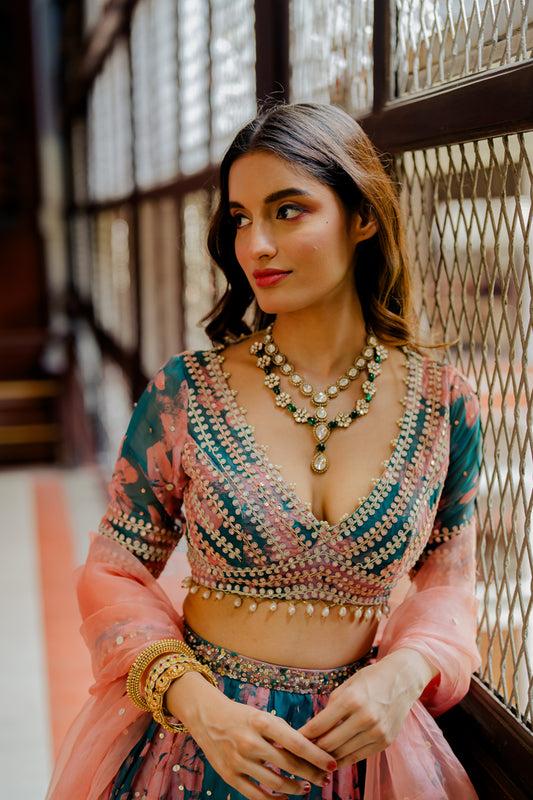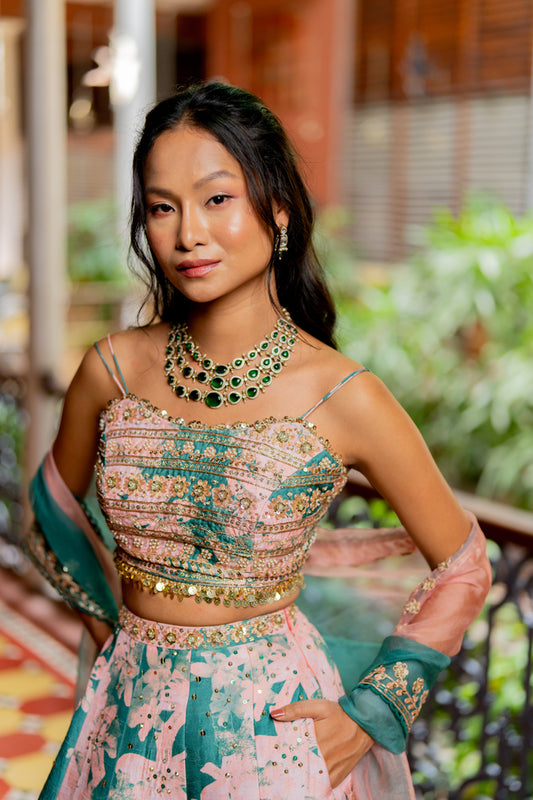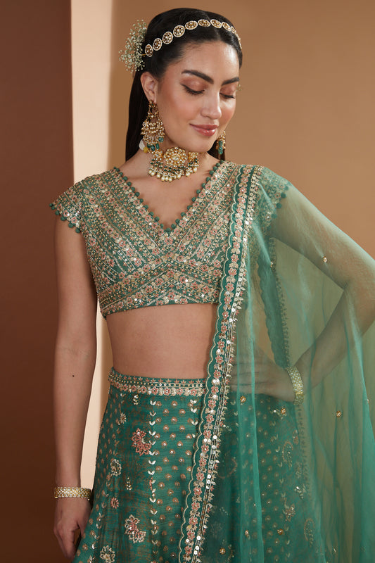 Green Floral Printed & Embroidered Silk Lehenga Set