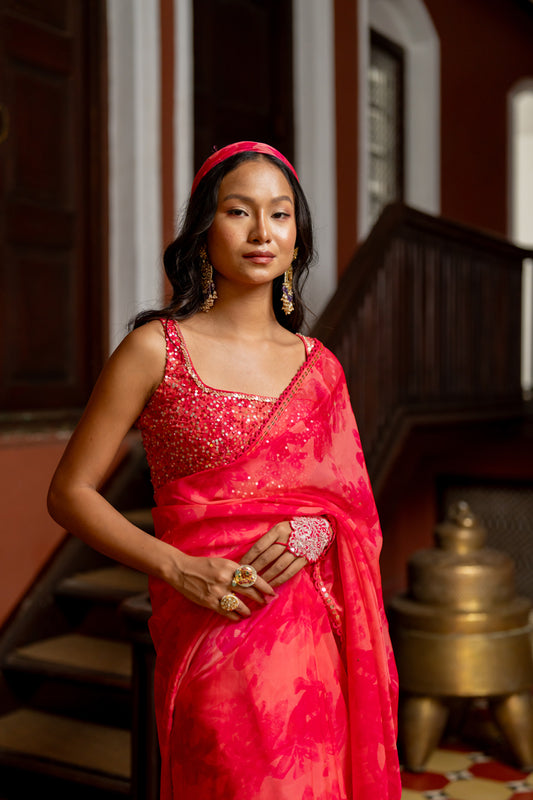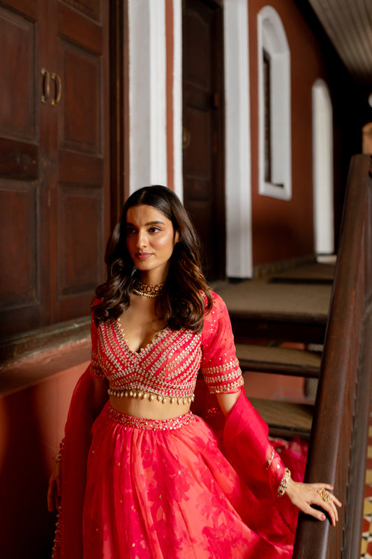 Fuchsia Printed & Embroidered Organza Lehenga Set