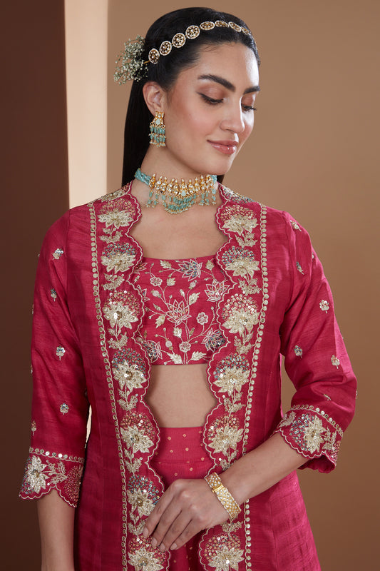 Fuchsia Silk Embroidered Long Jacket Sharara Set
