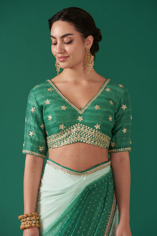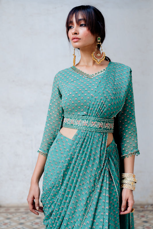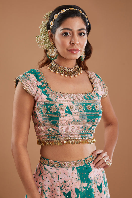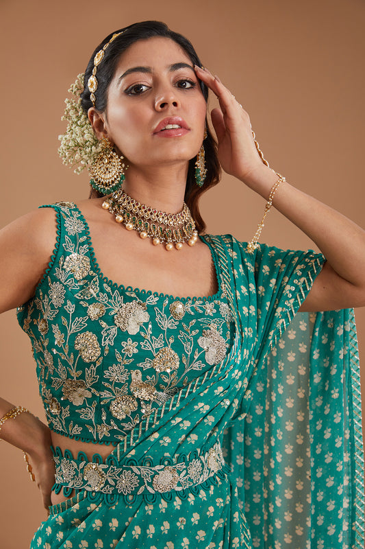 Green Silk Printed & Embroidered Concept Lehenga Set