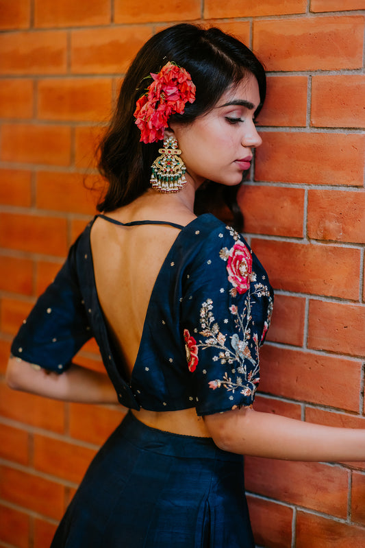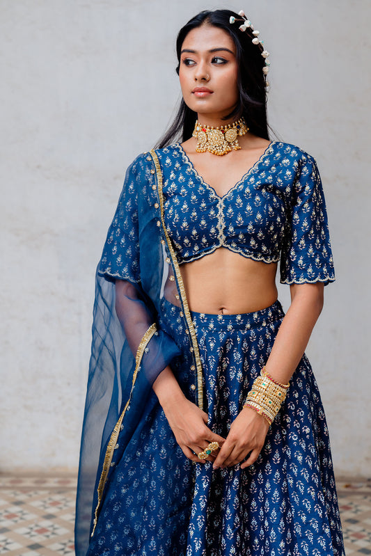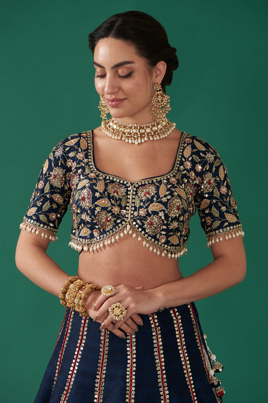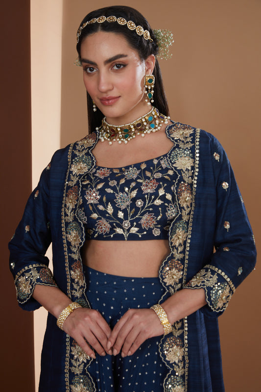 Indigo Silk Embroidered Luxurious Floral Lehenga Set