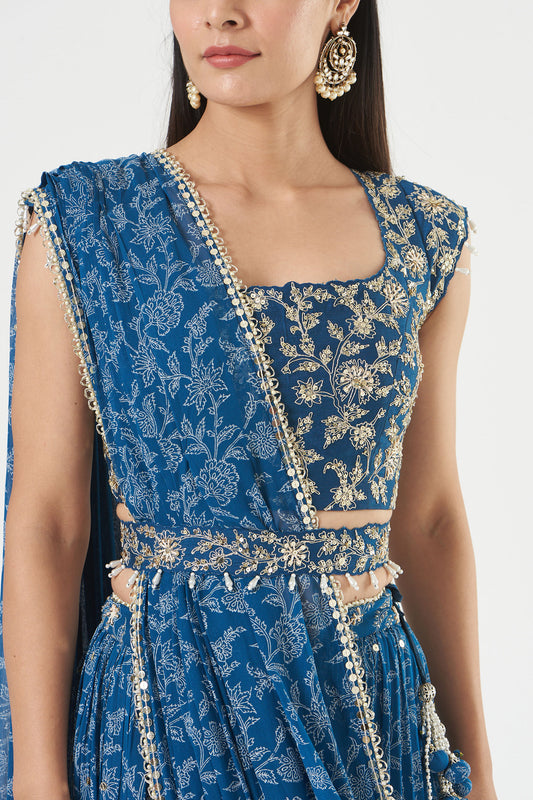 Indigo Georgette Tiered Skirt And Draped Dupatta Set