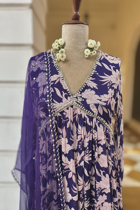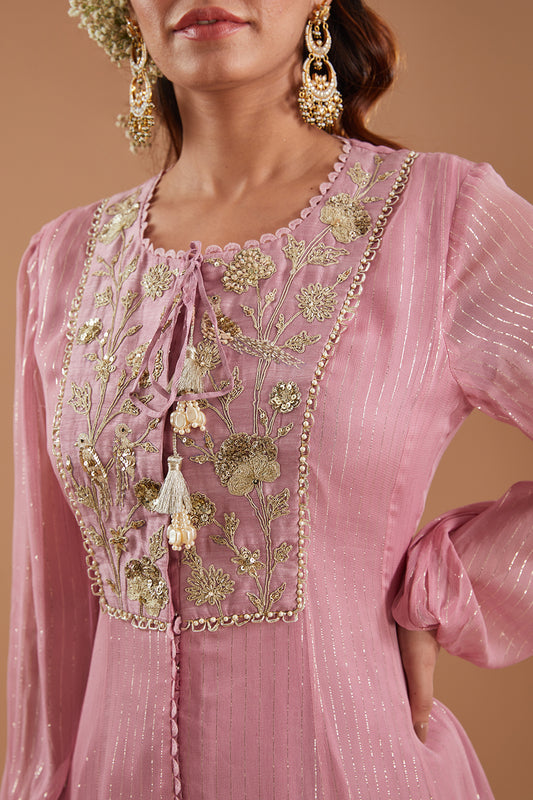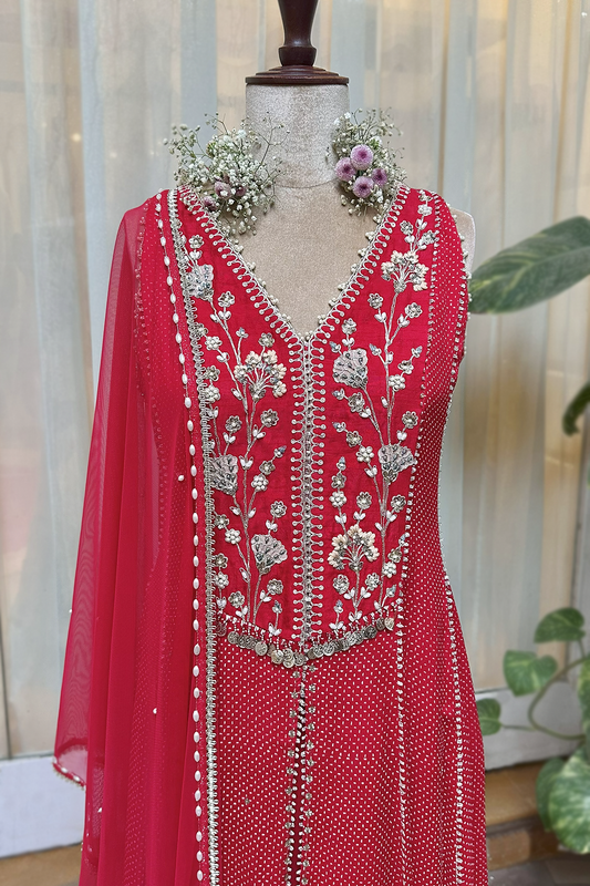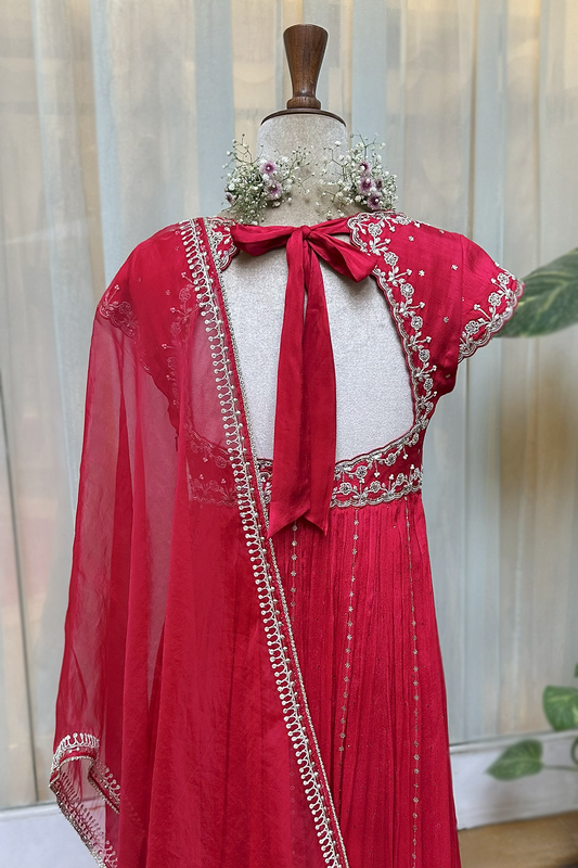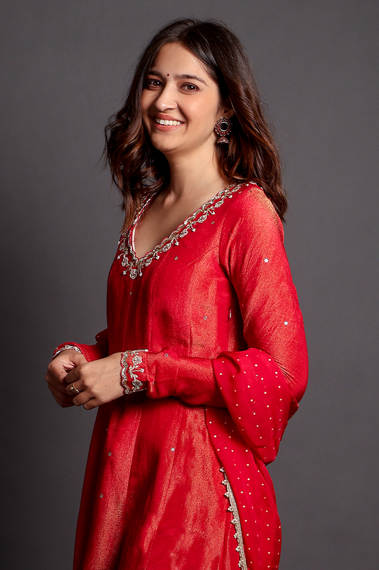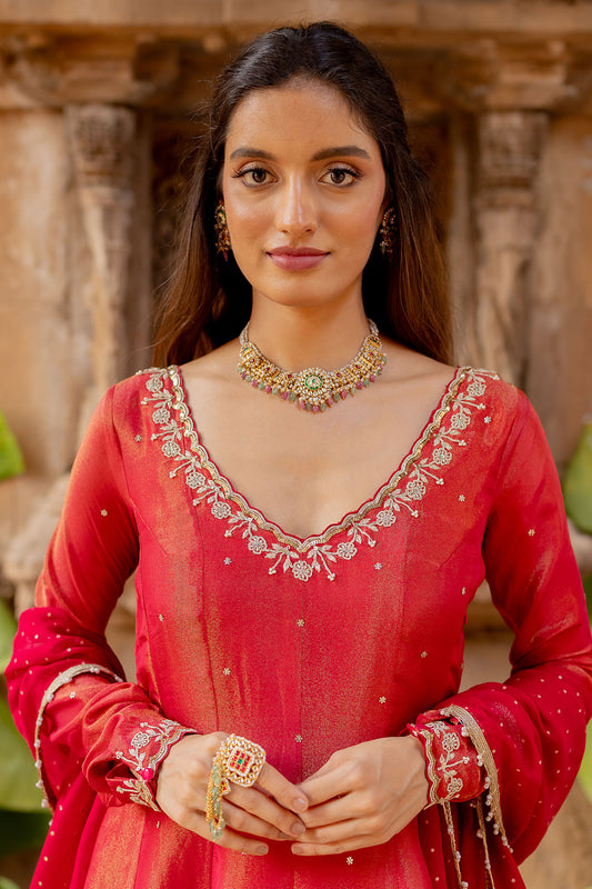 Kavita In Cherry Tissue Embroidered Anarkali Set