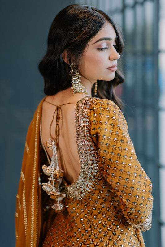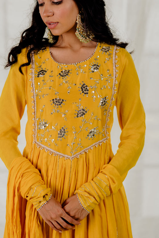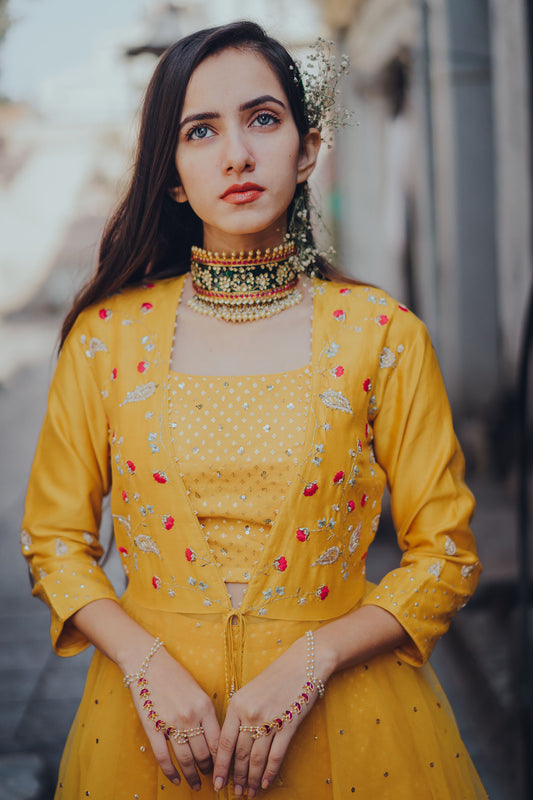 Mustard Paisely Embroidered Jacket Anarkali Set