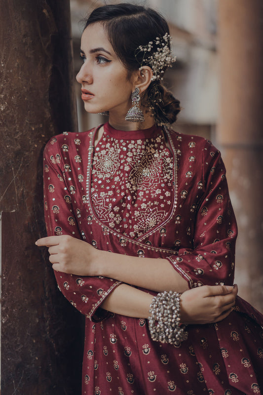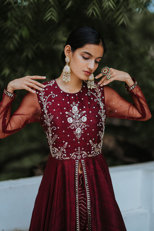 Wine Chanderi Embroidered Angarakha Dress Set