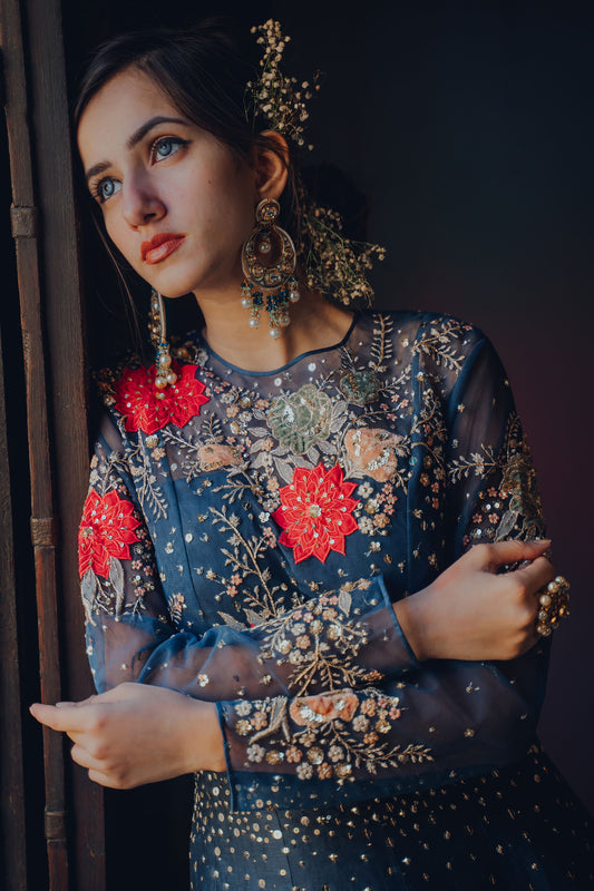 Indigo Roses Embroidered Gown
