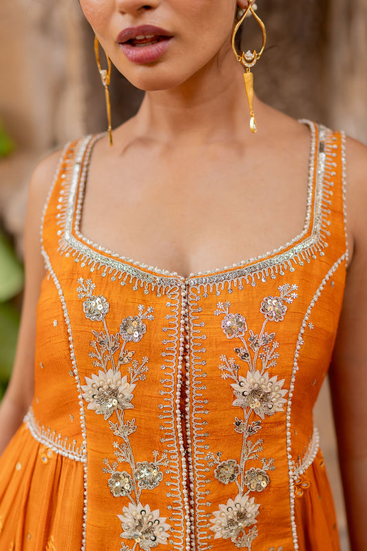 Tangerine Silk Embroidered Jacket Anarkali Set
