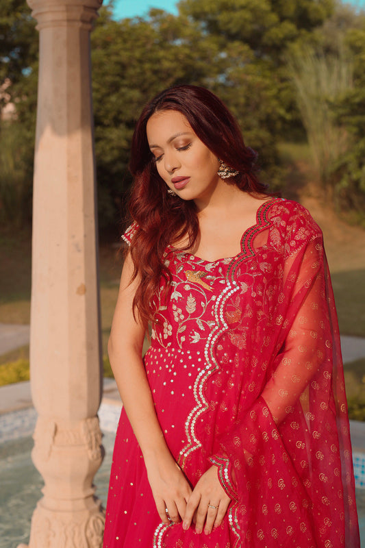 Cherry Red Silk Embroidered Anarkali Set
