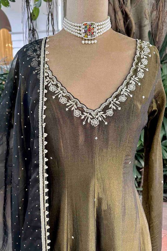 Black Olive Tissue Embroidered Anarkali Set